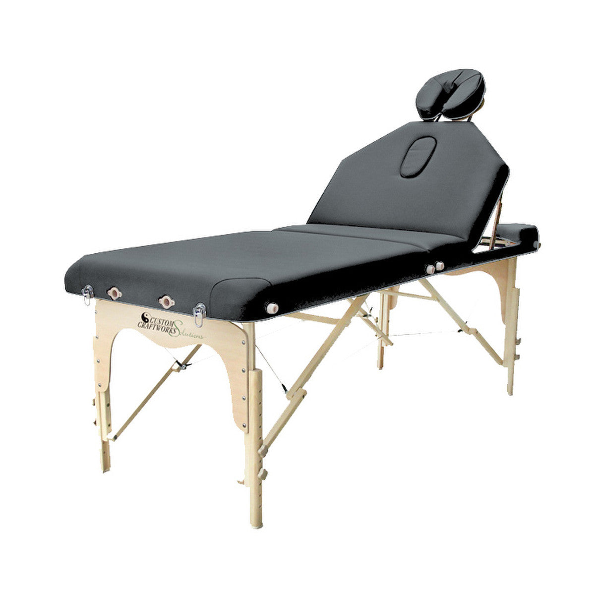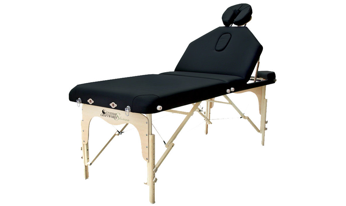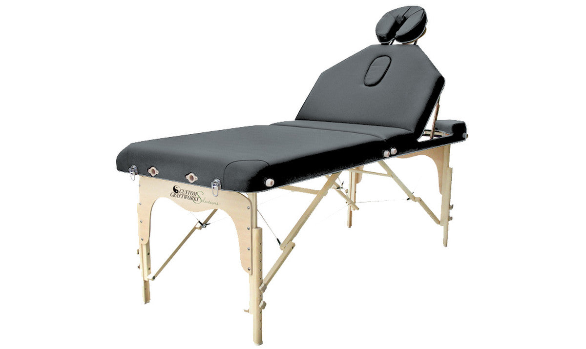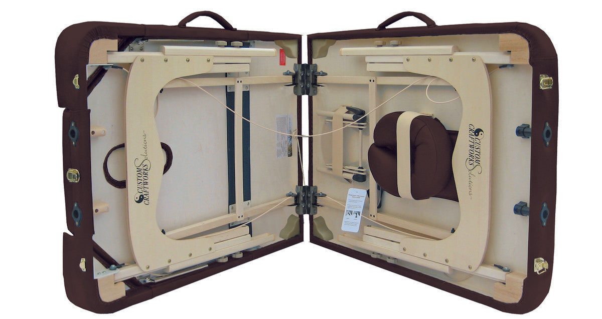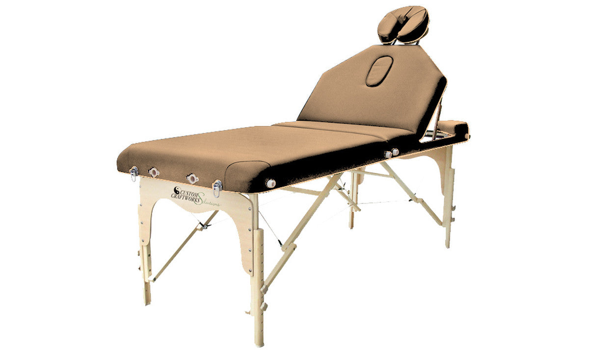 A very affordable lift back portable massage table, the Destiny table gives you multi-purpose performance. Our 10-step tilt-back mechanism accommodates all forms of traditional massage as well as reflexology, facials, and waxing. The Destiny model includes a Solutions classic adjustable face rest with crescent pillow, arm sling and carry case. Available in 5 colors: Beige, Black, Charcoal, Chocolate and Otter.