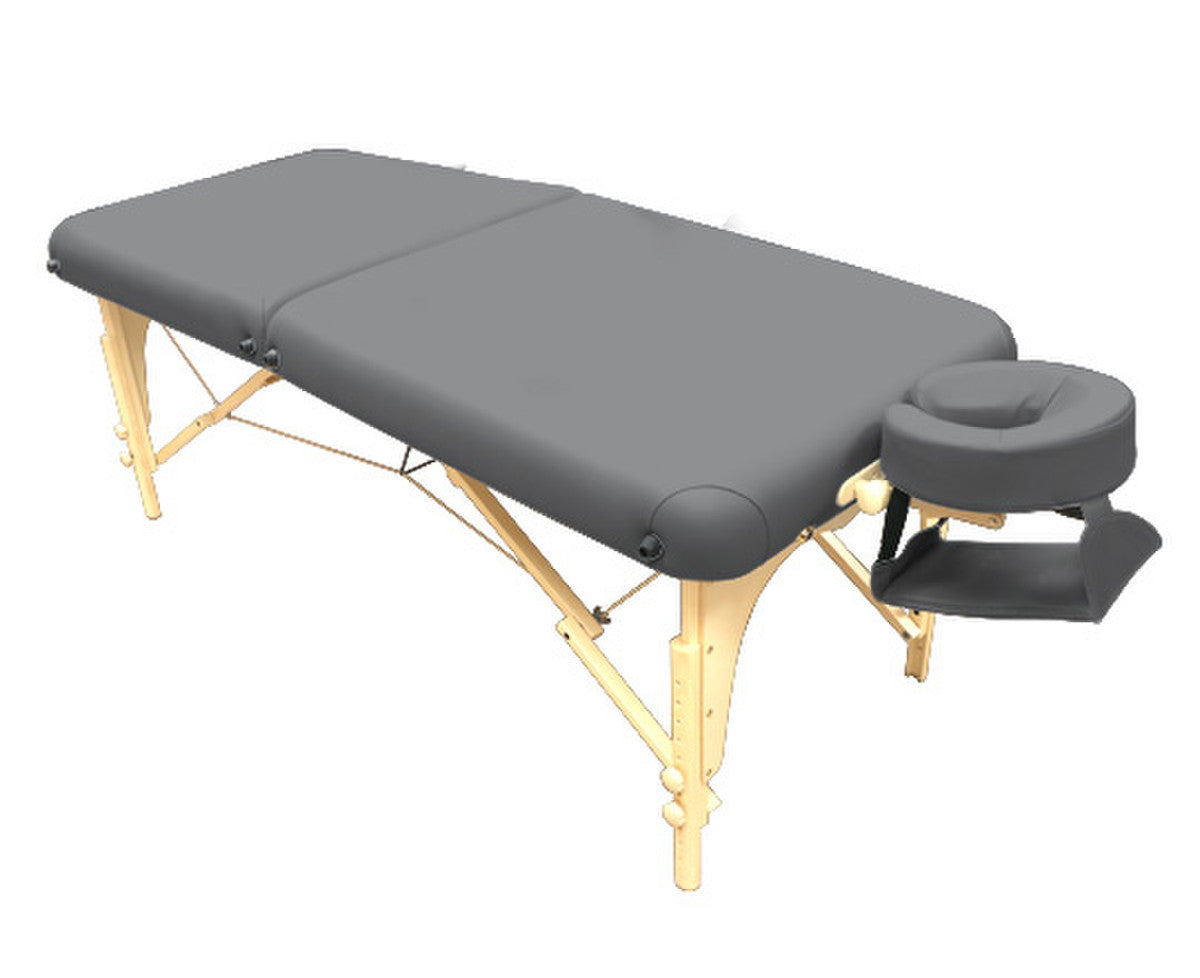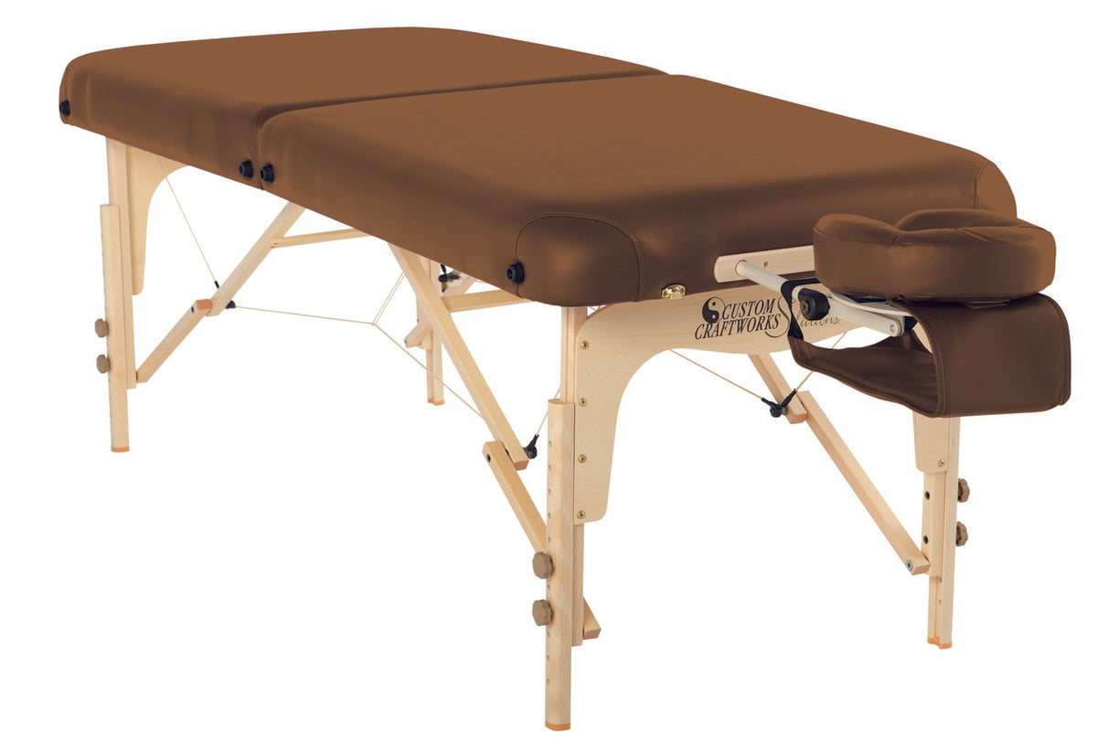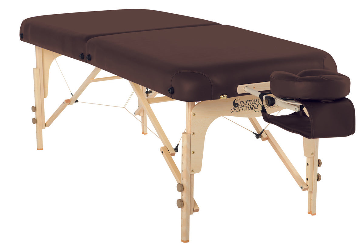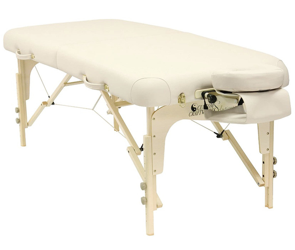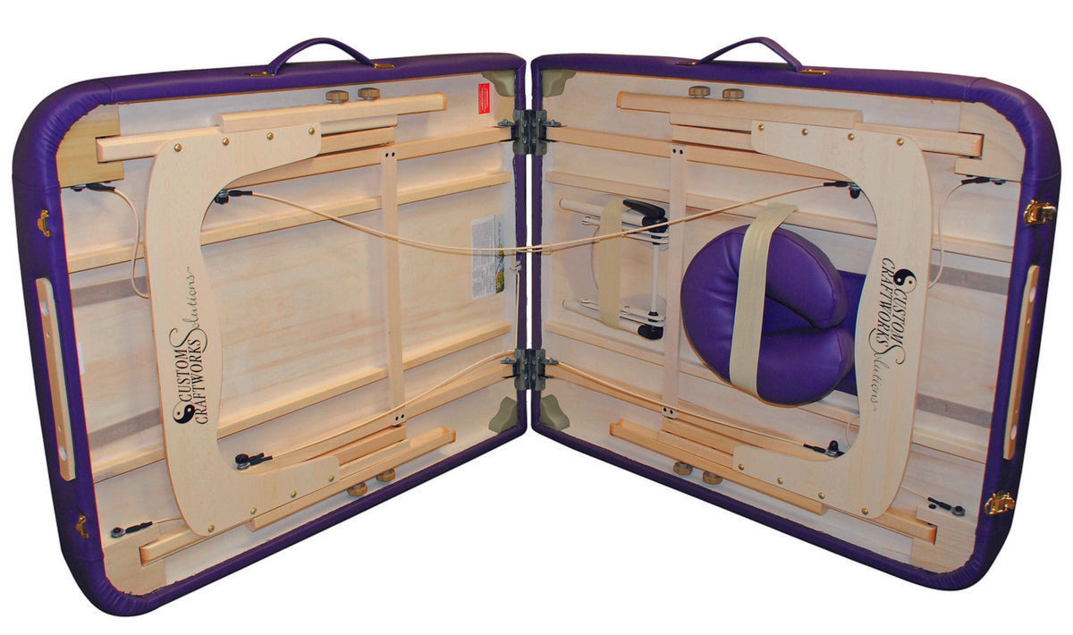 The Heritage portable table offers rounded corners, dual knobs, a strong and flat working surface, and ergonomically designed Reiki end panels. It also accommodates your knees for mobility all around the table. With the Shiatsu release cables, this table can easily lay flat on the floor. This feature filled table is an unbelievable value and the #1 choice among schools. The Heritage model includes the Solutions classic adjustable face rest with crescent pillow, carry case, and front arm sling.