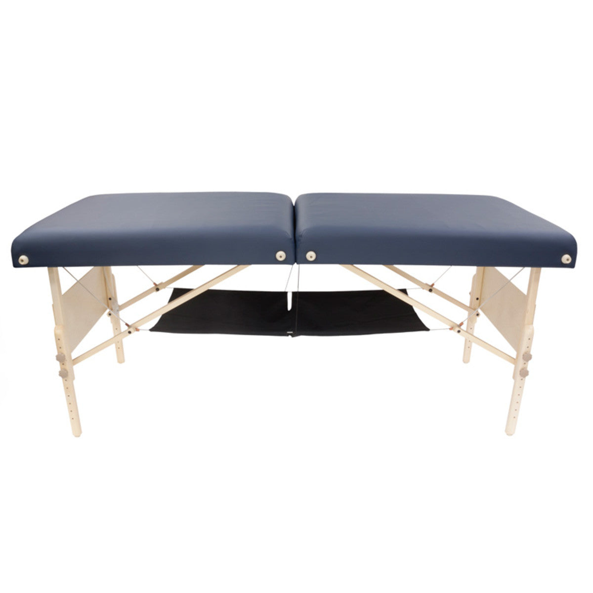 Keep your oils, creams, lotions, and other massage supplies close at hand with this handy under-table shelf for storage. Made of black cordura fabric (like a backpack) for durability and resistance to wear. Easily attaches to cable supports of most standard-size portable massage tables. Machine washable.