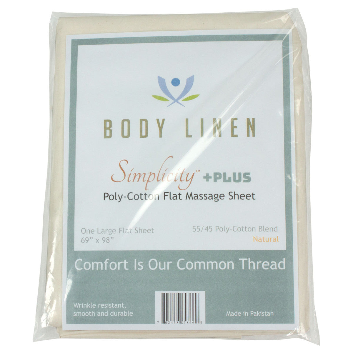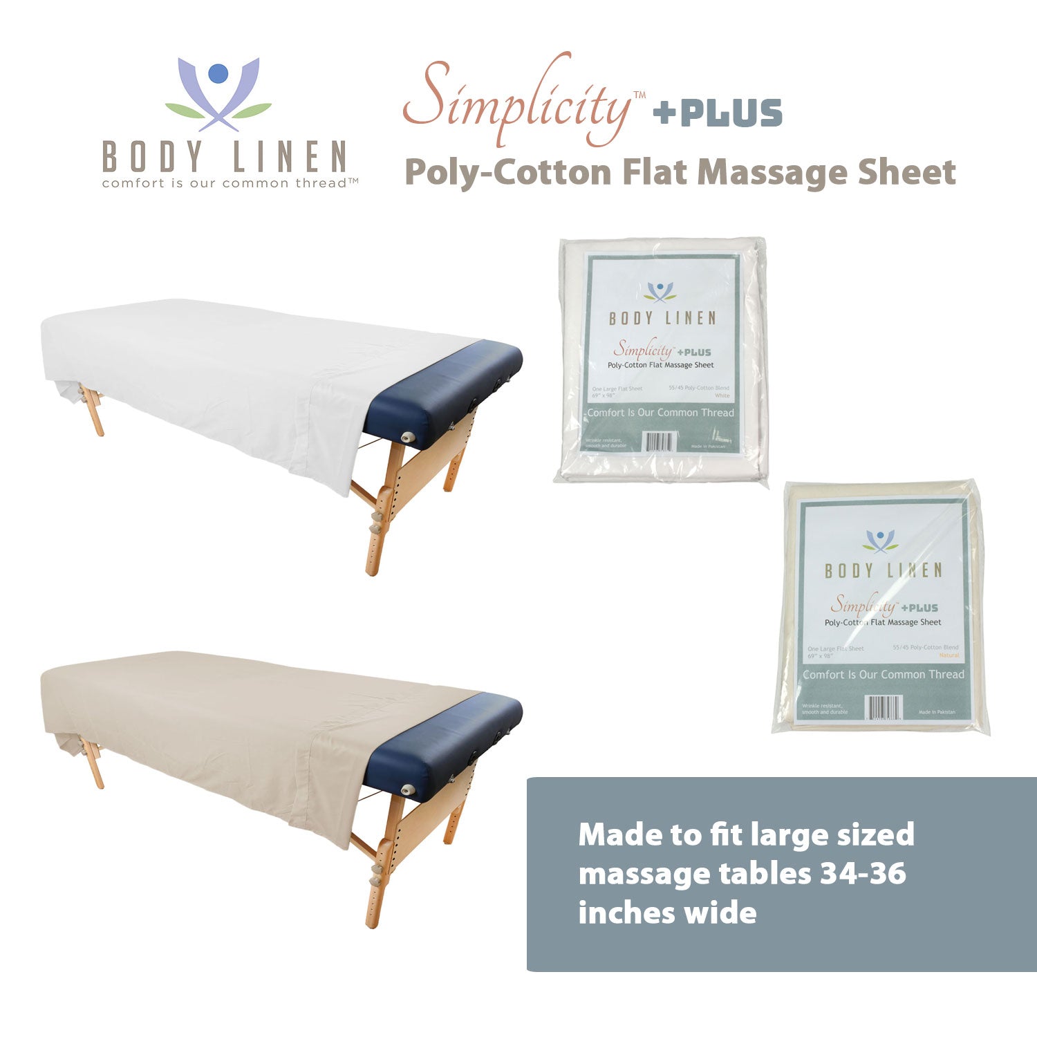 Simplicity™ + PLUS sized poly cotton flat sheets are specifically made for larger than standard massage tables. Typical massage sheets are for massage tables 28-32 inches wide. Our PLUS sheets are for massage tables 34-36 inches wide. Our 200 thread count poly cotton sheets are durable, affordable, and provides a wrinkle free light weight comfort that you and your clients will appreciate. These oversized flat sheets are also terrific at ensuring your larger clients will be covered 100% of the time, allowing them to remain relaxed through position changes.