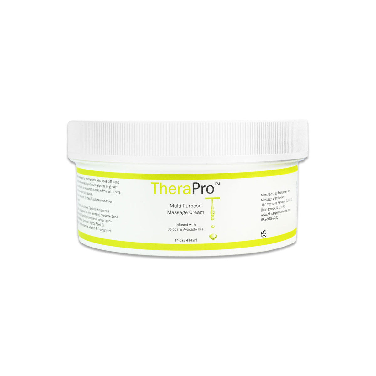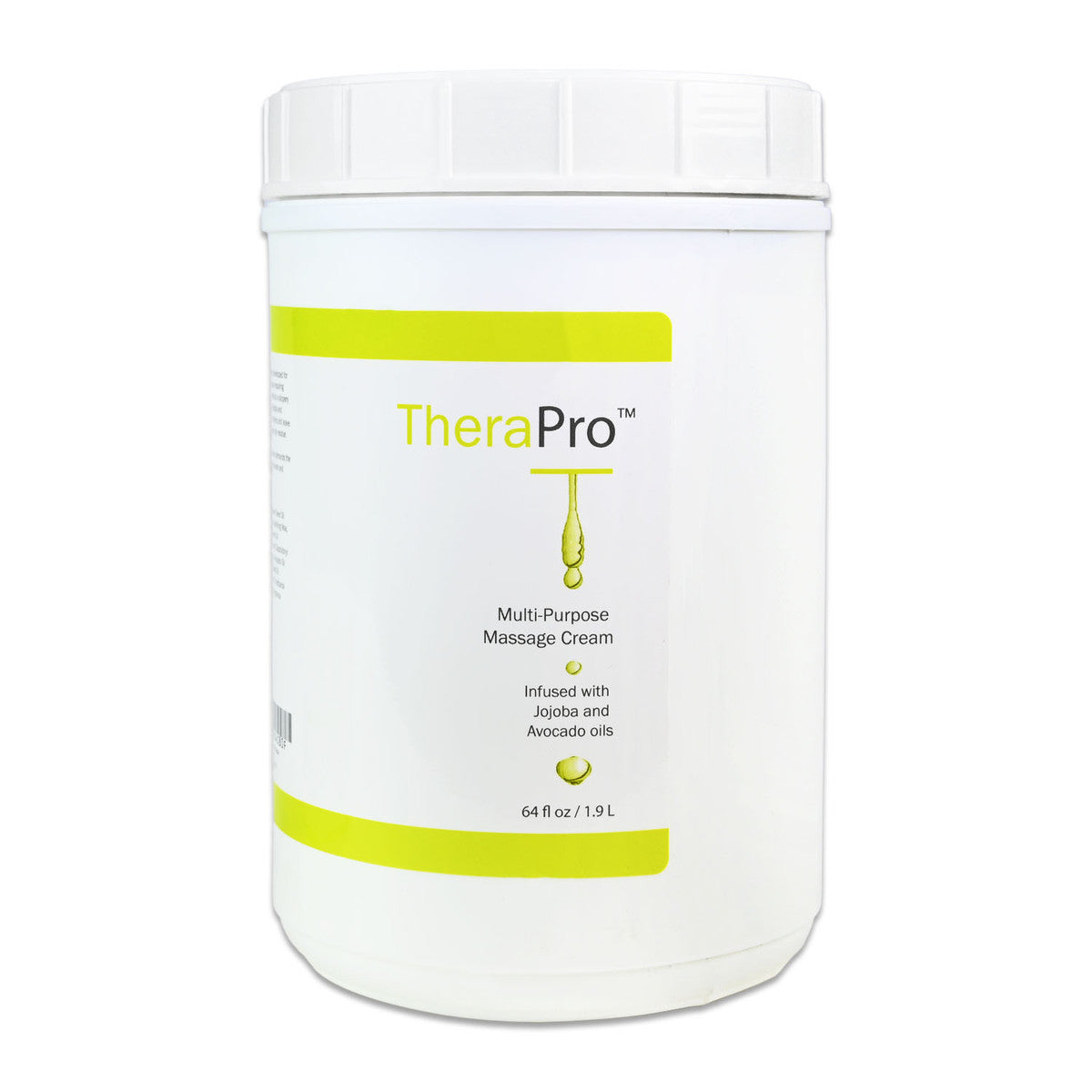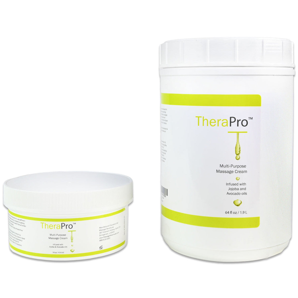 TheraPro Multi Purpose Massage Cream is our most popular massage cream and is the perfect solution for the Massage Therapist who uses multiple massage techniques that require a smooth glide, extended workability and minimum friction without a slippery or greasy feeling. This massage cream is extremely versatile and can be used for deep tissue work as well as lighter types of relaxation massage. Your clients will appreciate the moisturizing effects of this multi-purpose massage cream. Quality ingredients like jojoba oil and avocado oil separate this massage cream from all the others and leave the skin feeling smooth and nourished without an oily or greasy residue. TheraPro Multi Purpose Cream is hypoallergenic and specifically formulated to easily wash out of linens by simply using hot water and everyday laundry detergent. TheraPro Multi Purpose Massage Cream is available in a 14 oz, 1/2 gallon, or 1-gallon containers.