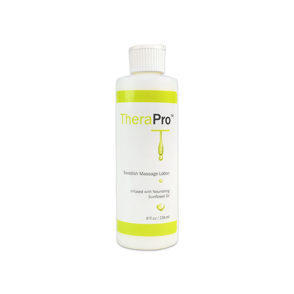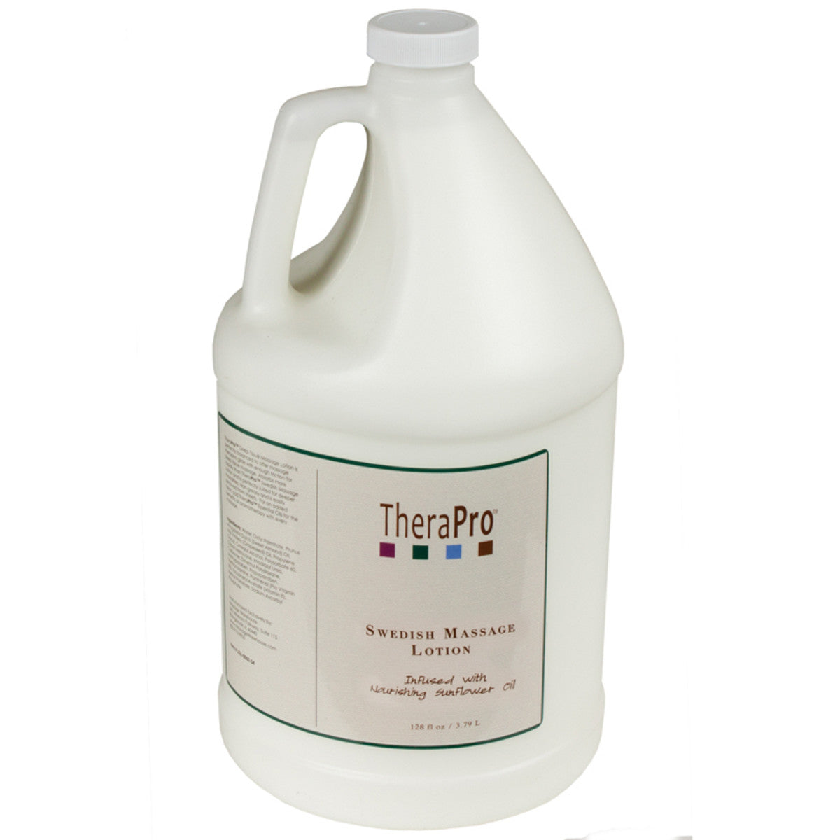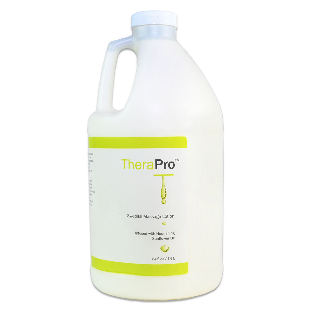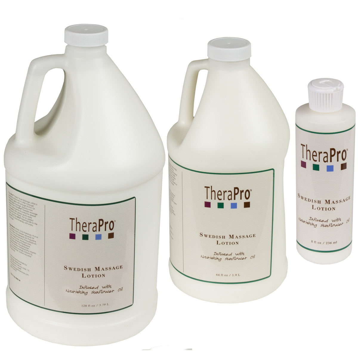 TheraPro Swedish Massage Lotion provides a smooth glide and lasting workability, without the residue associated with most oils. It’s easily cleaned from sheets using any laundry detergent. Try adding a few drops of TheraPro essential oil blends for the benefits of aromatherapy. Water dispersible. Available in 8 oz, 1/2 gal., 1 gal. and 5 gal. containers.